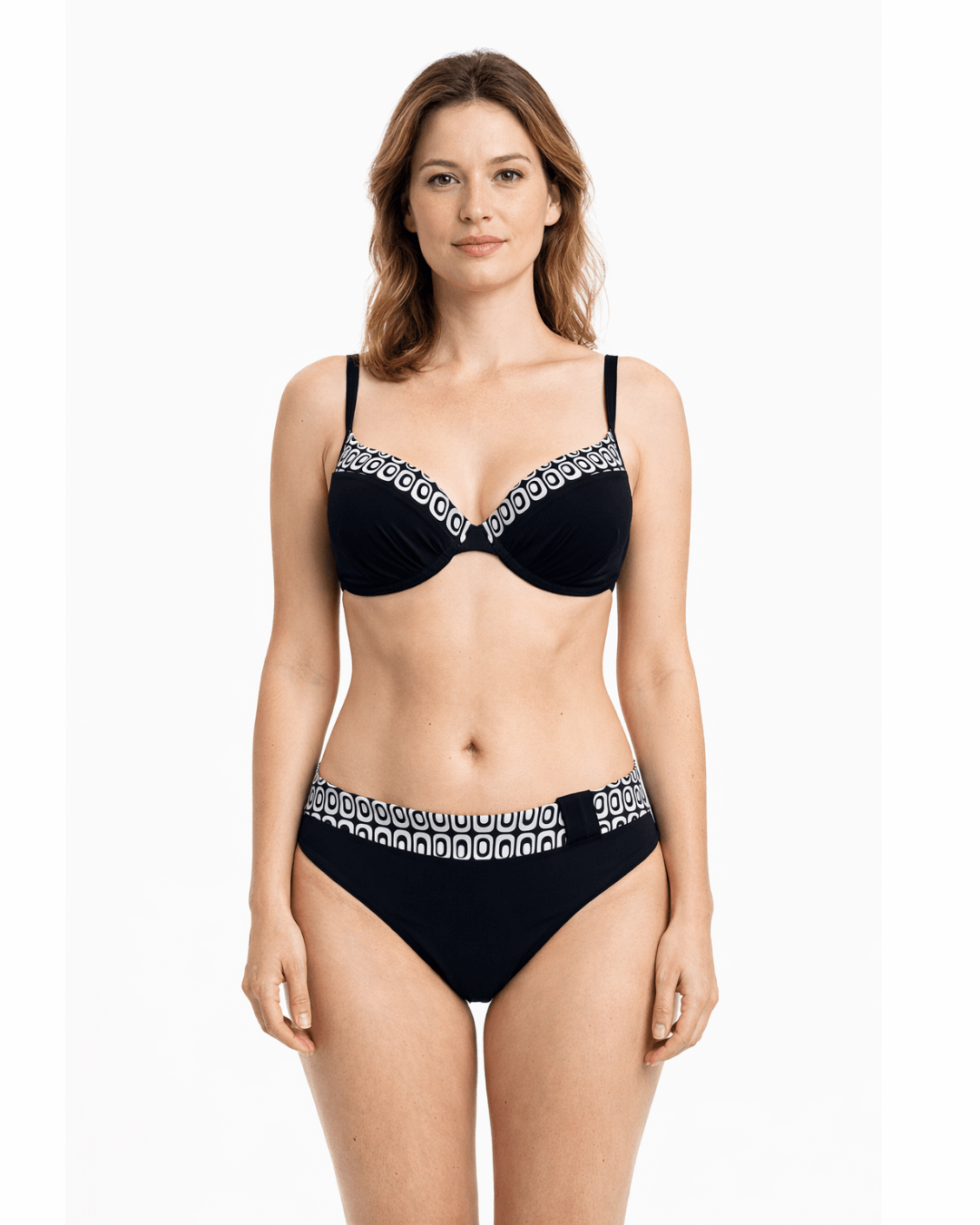 Dvodelne kopalke Kuba Črne združujejo brezčasen eleganten videz in odlično oporo. Klasična črna barva v kombinaciji z diskretnim kontrastnim vzorcem ustvari sofisticiran poletni stil, ki lepo poudari postavo.